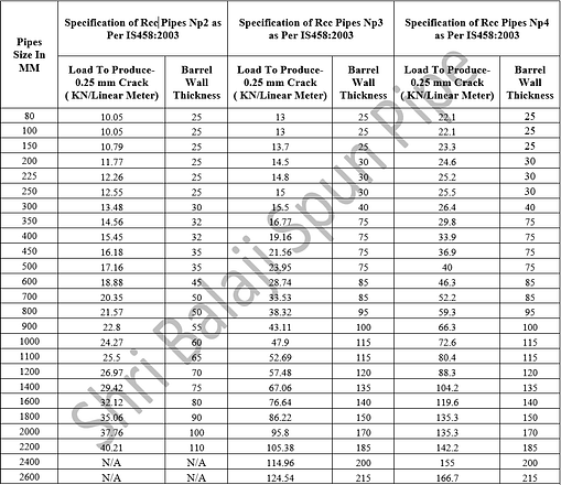 for 8cm dia and 2.6m dia respectively. there is an NP4 class also. all the remaining being same except the thickness. IS:458-1988 deals with the requirements.