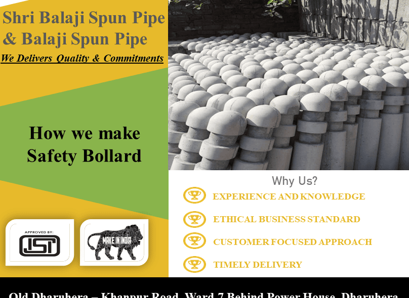 First steel reinforcement cage is prepared with 8MM TMT Bars. After that concrete mixture is prepared in M30 grade. Mixing water in the cement, sand and stone will form a paste that will bind the material until the mixture hardens. Once the mixture is ready Mould are assembled and steel cage is inserted in moulds and concrete mixture is fed into the moulds and settle the mixture properly with vibration table which is called vibration compaction method using plastic moulds for impeccable finish. After a while moulds are removed and Bollards are Finished with Homogeneous layer of cement plaster 1:1 (Cement & Sand) and after that submersed in the curing tank for 7 days