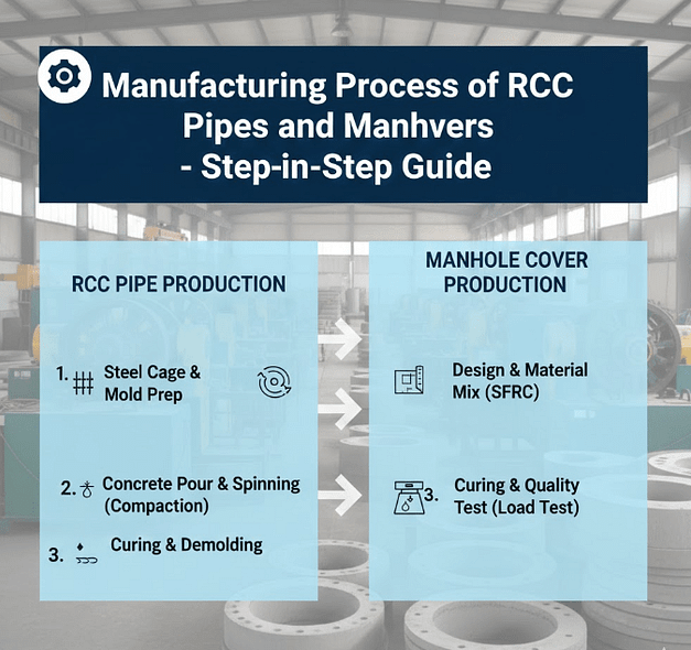 The manufacturing process of RCC pipes and manhole covers determines their quality. Therefore, a strong process produces strong and long-lasting products. Also, workers must follow each step carefully to ensure durability and safety.